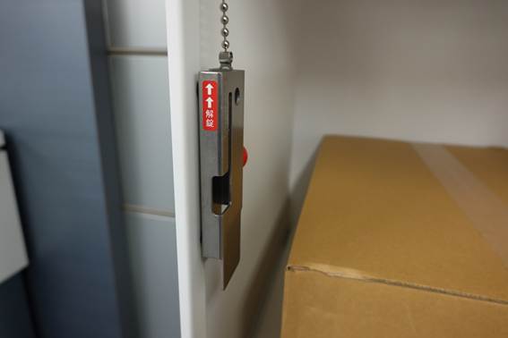 竹内様:非常脱出用のレバーです。万が一、小学生のお子さまがかくれんぼなどで宅配ボックスに入ってしまってもレバーを操作すると出られるように設計しています。大きな宅配ボックスは、閉じ込め防止機能が必要です。